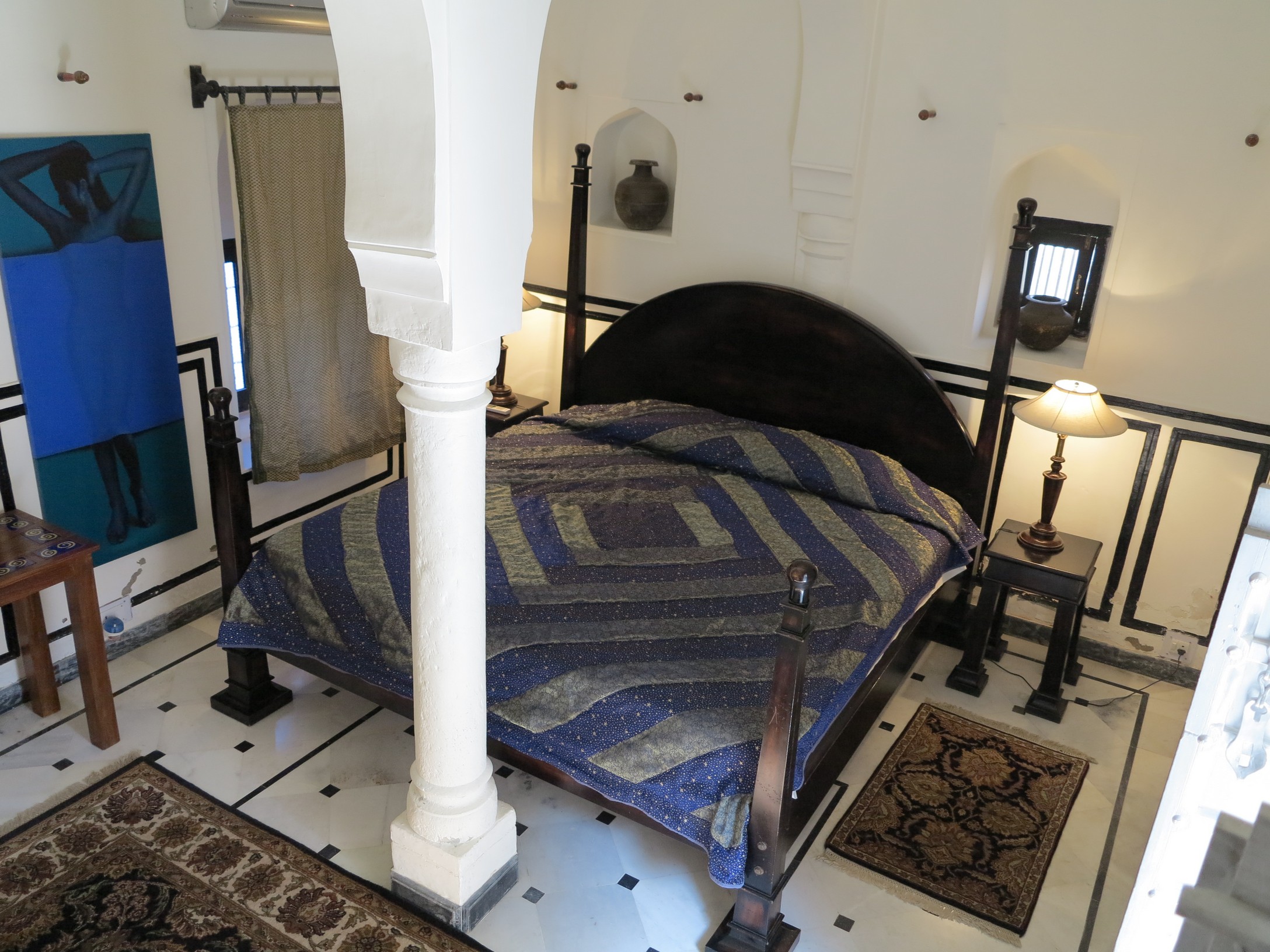 Blue Rooms in the hotel are extra large king size rooms in ebony color bed and Rajasthani sitting arrangements, beautifully decorated art arches. The bathrooms are Blue/White in color with modern fittings. The rooms are fully furnished and well maintained.